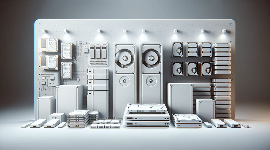 /imagine prompt:A collection of storage devices including hard drives, SSDs, memory cards, and USB sticks, arranged neatly on a futuristic desk with glowing lights, holographic interfaces. Created Using: photorealistic style, dynamic lighting, high-detail textures, sleek and modern design, metallic and neon color palette, technological ambiance, hd quality, natural look –ar 16:9 –v 6.0