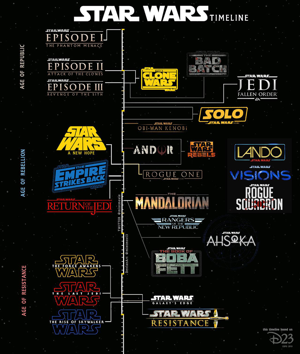 在Google搜索了一下,国外网友对《星球大战》的观看顺序制作图片的热情很高,有很多很有水平的图片,挑选了一张比较新的按故事发生时间顺序的制图给大家参考: